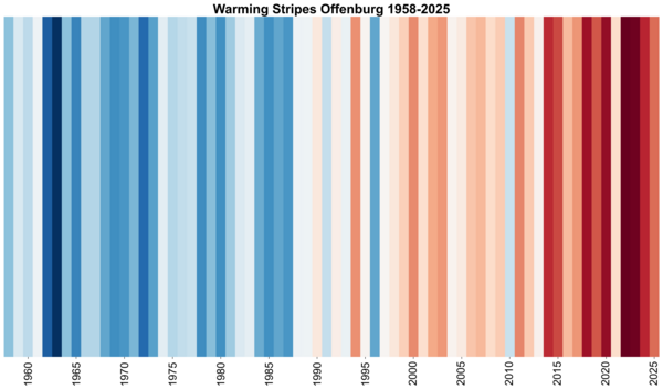 Eine eindrückliche Grafik, die sogenannten „Warming stripes“ nach Ed Hawkins, zeigt die Veränderungen der Jahresdurchschnittstemperatur in den letzten Jahrzehnten. Jeder Balken entspricht der Mitteltemperatur eines Jahres. Die dunklen Blautöne stehen für kühlere Jahre, die helleren Farben bedeuten Jahre mit durchschnittlichen Jahresmitteltemperaturen und die roten Farben wärmere Jahre. Auffallend ist in den 1990ern der klare Umschwung von blau gefärbten Jahren zu fast durchgehend roten. Die Mehrzahl der warmen Jahre liegt eindeutig innerhalb dieses Jahrtausends, die Mitteltemperaturen lagen bis auf zwei kühlere Jahre immer über 11 °C und erreichte mit der dunkelsten Rotfärbung 2022 mit 13,48 °C einen Rekord. Während im 20. Jahrhundert die Jahresdurchschnittstemperaturen noch zwischen 8 und 10,5 °C lagen.