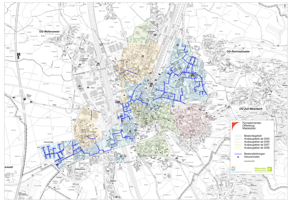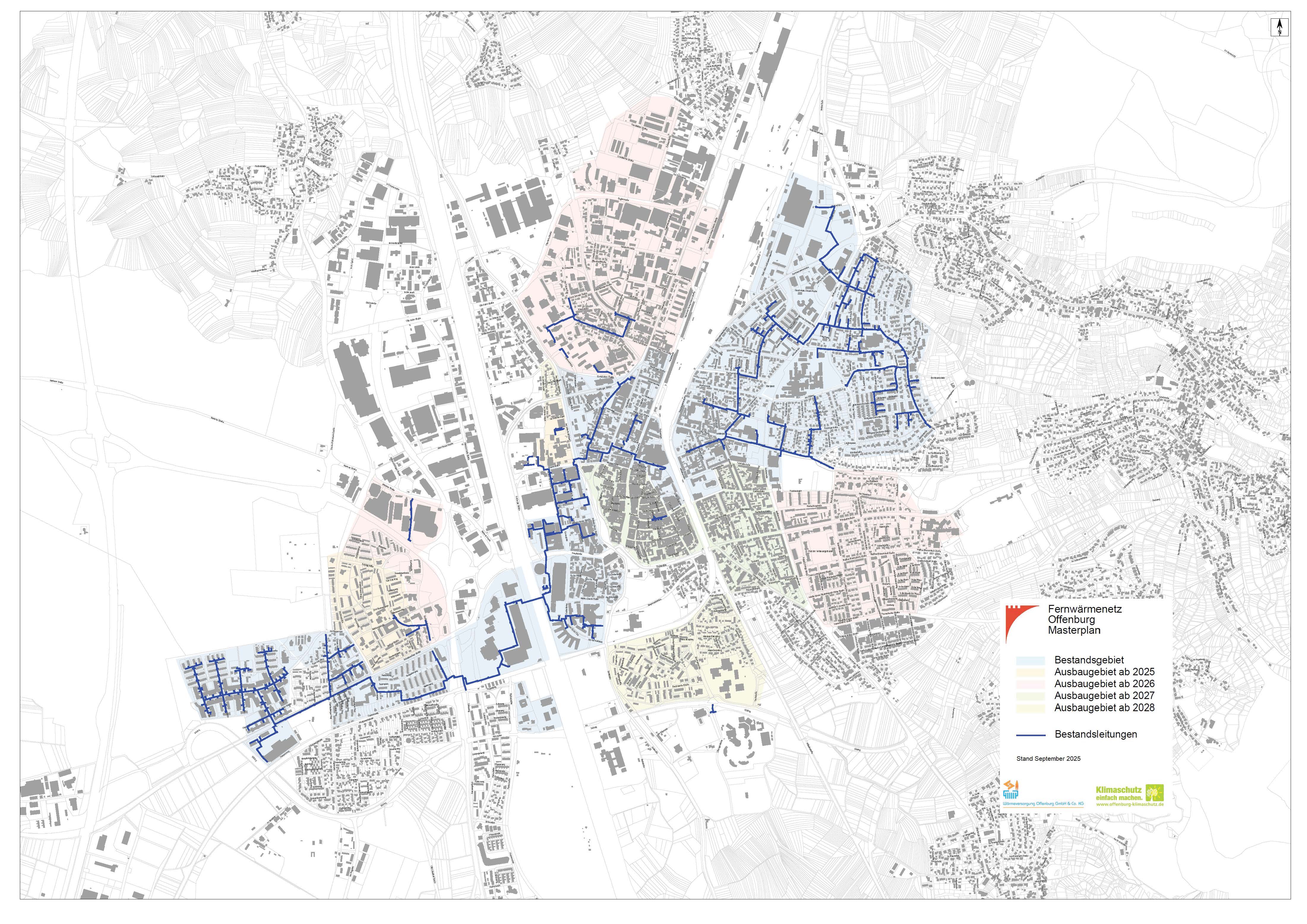 Eine zentrale Maßnahme aus der Wärmeplanung ist der Ausbau der Fernwärme im Stadtgebiet. Diese erfolgt derzeit in drei bislang noch unabhängig betriebenen Netzen: In der Nordoststadt, im Zentrum und in Albersbösch. Die drei Netze wachsen langsam zusammen. Dabei stellt der Ausbau der Fernwärme im Bestand den Netzbetreiber vor große Herausforderungen. Angesichts der bereits im Boden liegende Leitungen und Rohre sowie das Wurzelwerk des Baumbestands müssen bereits geplante Streckenverläufe oft neu- oder umgeplant werden. Auch Hindernisse, wie Bahnlinien oder Wasserläufe erfordern teilweise technologisch äußerst komplexe Lösungen. Entsprechend ist der Ausbau der Fernwärme in Offenburg ein extrem dynamischer Prozess.